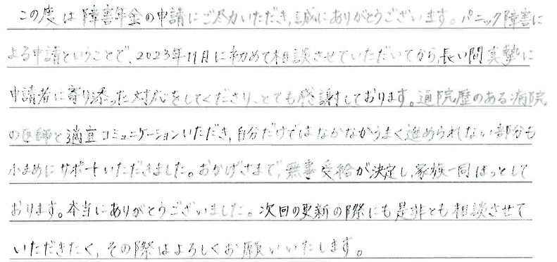 この度は障害年金の申請にご尽力いただき誠にありがとうございます。パニック障害による