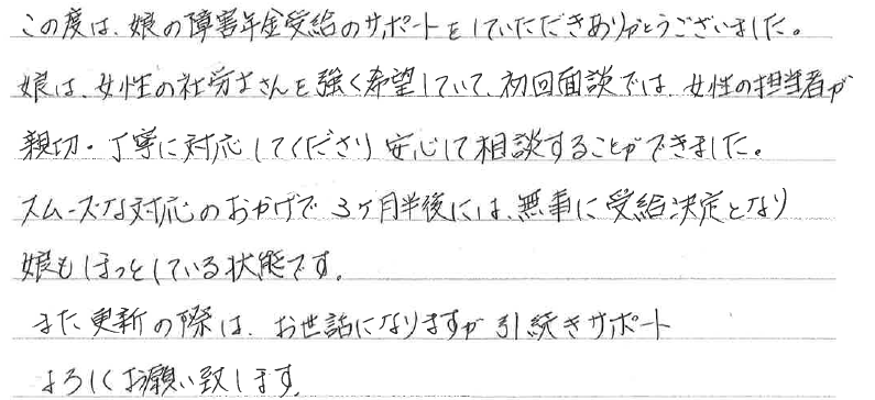 この度は、娘の障害年金受給のサポートをしていただきありがとうございました。